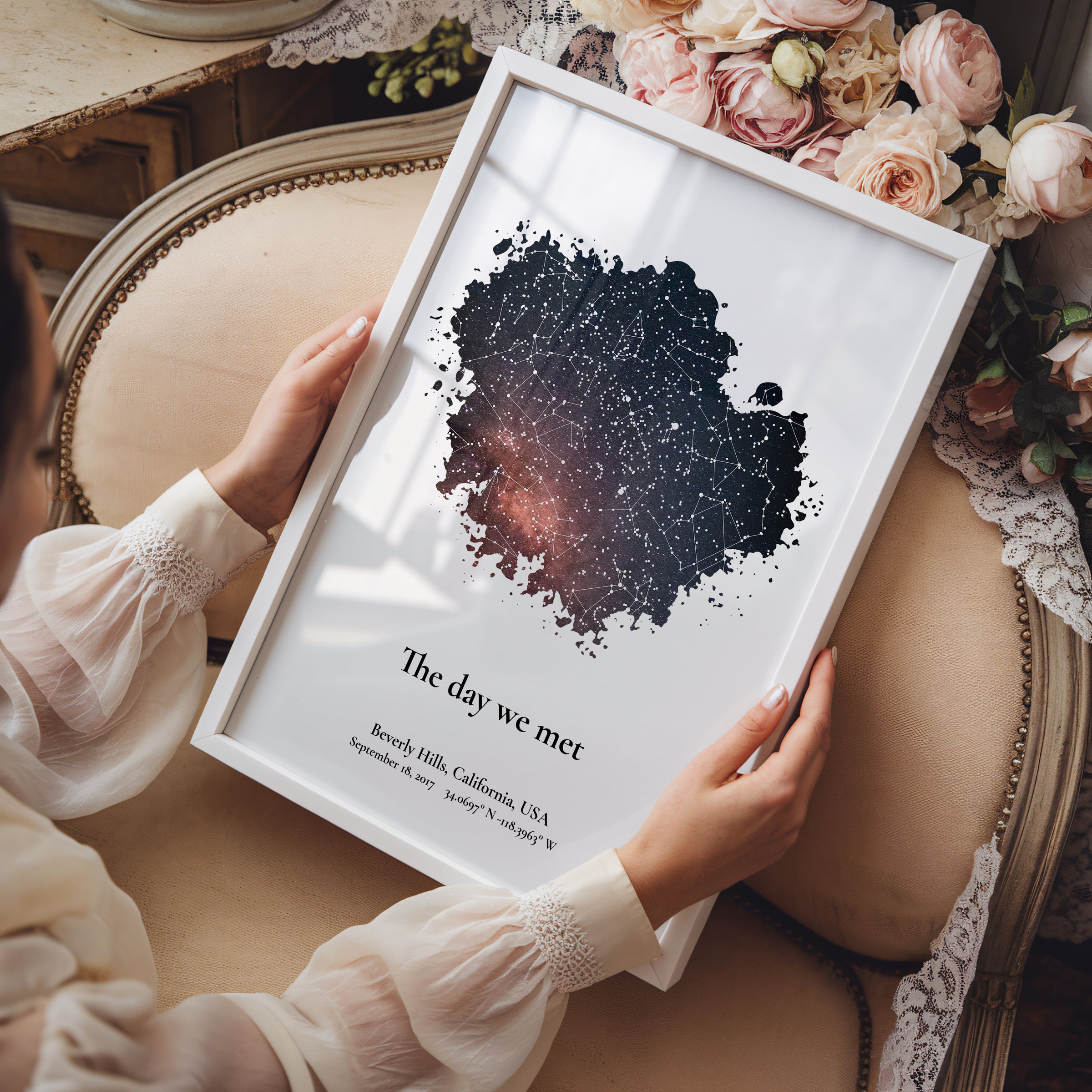 Commemorate your anniversary with a custom star map poster! Featuring a constellation map of the night sky on your special date, it's the perfect, unique, and meaningful gift!